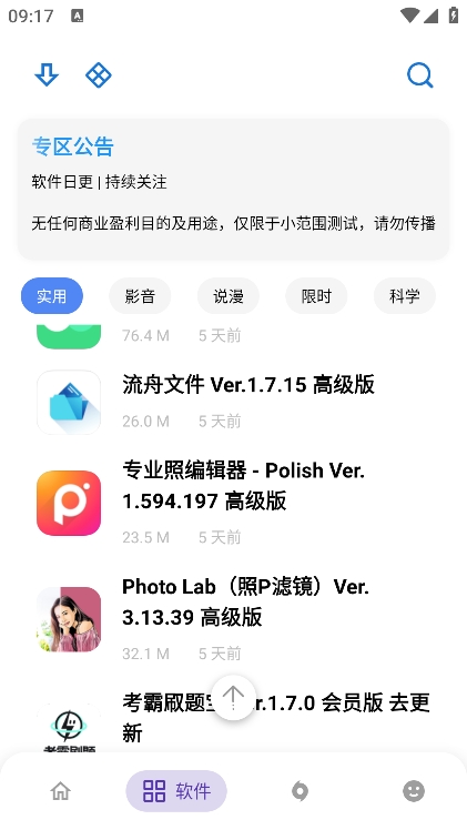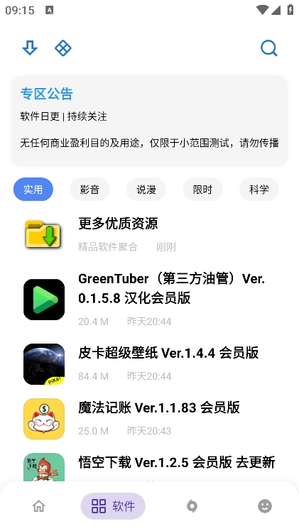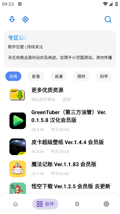 2、进入软件板块,有很多的软件资源分类,包括实用、影音、说漫等类型。