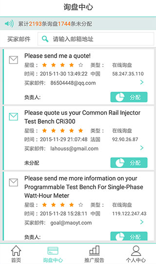 3、提供询盘中心功能,用户可以查看贸易通询盘,并进行询盘分配,提高工作效率。