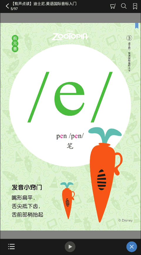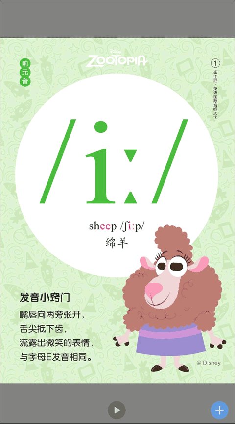 迪士尼英语国际音标入门app是一款以迪士尼疯狂动物城为角色原型的学英语绘本应用软件,将带领孩子们学习英语国际音标,寓教于乐、全彩设计、易学易记,从最基础的音标书写、发音窍门、单词示例慢慢的引导,所有的字母可组合,还有专家朗读,在家长的陪同下孩子们愉快的学习。