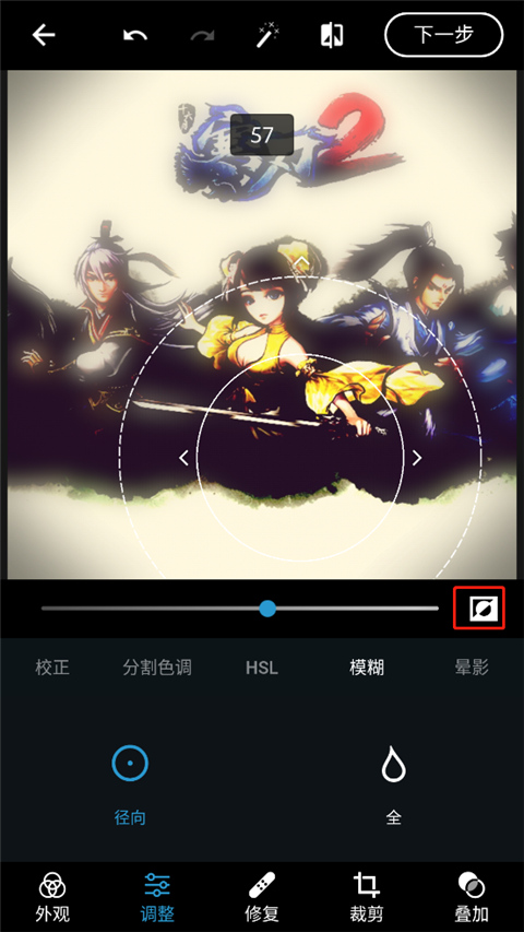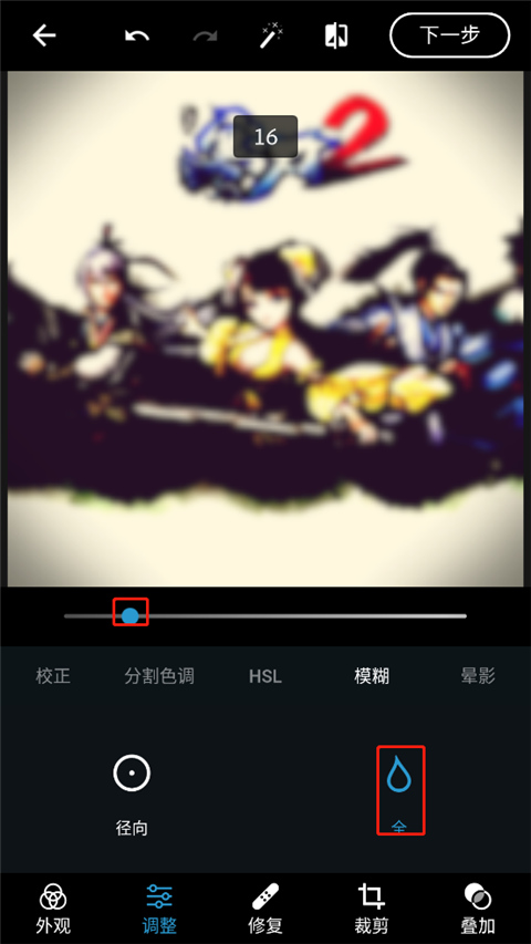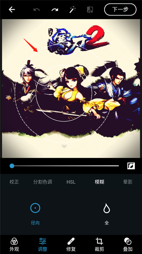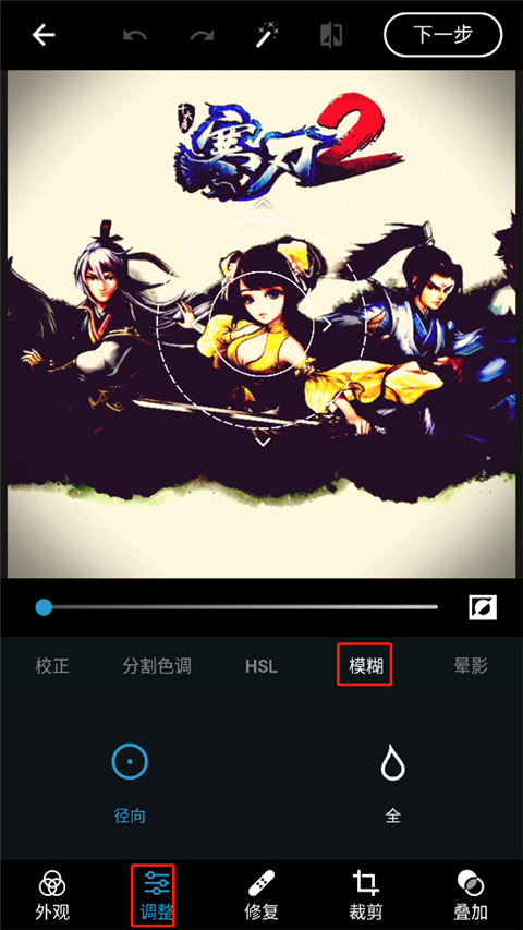 2、在“调整”面板中找到“模糊”功能,里面为用户提供了径向模糊(对照片中的特定区域进行模糊处理)和全模糊(对整个照片进行模糊处理);