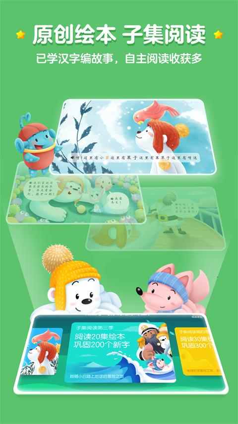 1、原创绘本分级阅读:自带130本独家原创高级阅读绘本。每本书都是用学过的汉字来编故事,故事科学、进步性强。孩子们可以毫不费力地独立阅读。