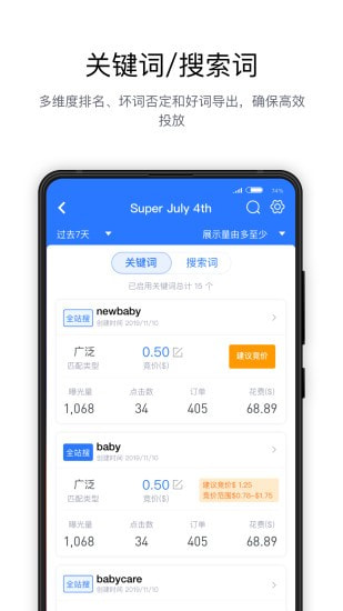 1、便捷的关键词/搜索词管理:多维度排名;坏词否定和好词导出;根据建议竞价快速调价