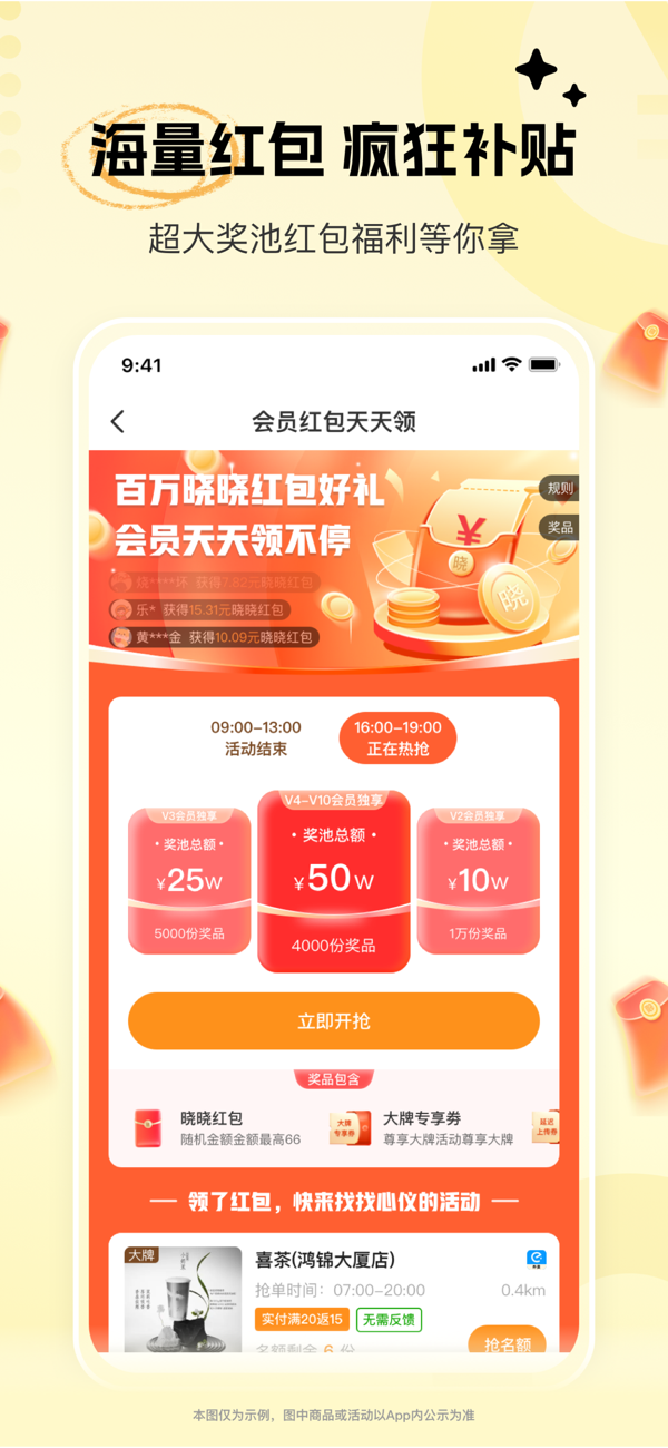 晓晓优选是一款实用的外卖服务折扣软件,提供大量的外卖红包和丰富的福利,用户每天可以领取大量外卖红包,还可以参加应用内抽奖活动,它可以通过应用程序向用户推送高质量的食品活动,并提供各种方式来节省购买商品和订购外卖的费用,每天都有大量来自各个平台的购物券可供领取,下午茶、奶茶、水果均可打折购买,你可以吃到嘴软了!这是一个非常实用的移动应用程序,可以帮助用户发现更多高质量的餐厅和美食活动,同时还可以让他们节省外卖费用。
