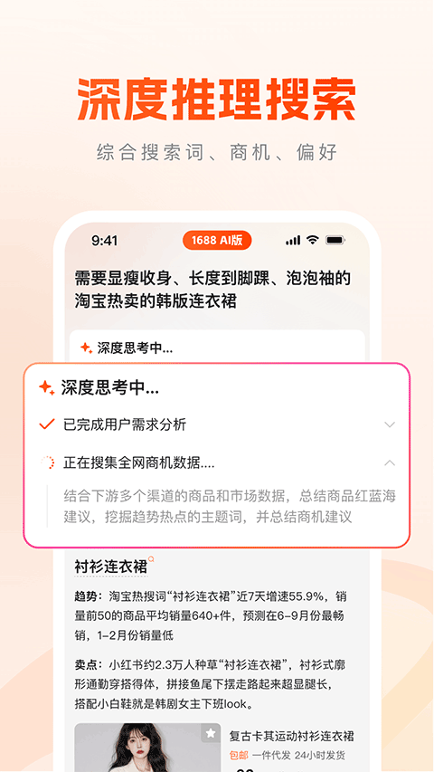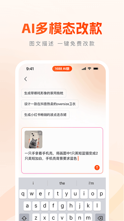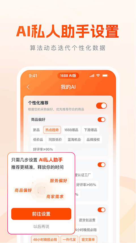 1688 AI版是一款专门为用户提供高效办公的软件,适用于需要进行采购的中小企业,用户可以通过应用程序中的举报和投诉功能来保护自己的权利,他们只需要输入自己的需求就可以完成产品的选择,效率非常高,用户可以随时随地通过手机浏览和购买来自世界各地的优质产品,打开通往全球商业市场的便捷之门,通过内置智能选品、精准比价、趋势预测三大功能,用户可以选择物美价廉的商品。