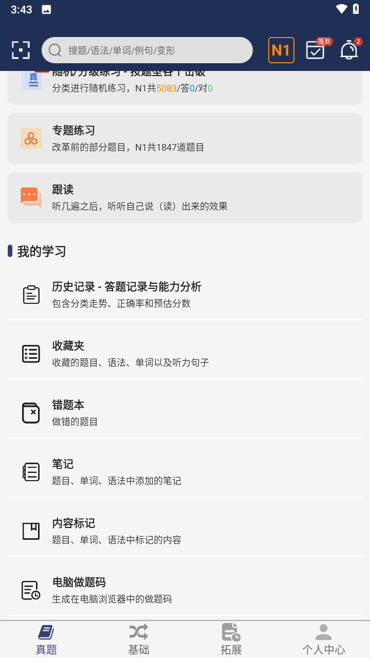烧饼日语是一款专业的日语学习软件,可以为用户提供专业的日语语法、汉字学习资料和自学辅助,它还为培训提供了大量的真实测试问题,软件中的日语考试题型分类清晰,方便用户选择和练习,收录了历年日本语言能力考试N1至N3的真实试题,在软件内,用户还可以进行严格逼真的真实考试模拟测试,帮助他们熟悉考试节奏,该软件会自动统计用户学习的单词数量,让用户清楚地了解自己的单词储备。