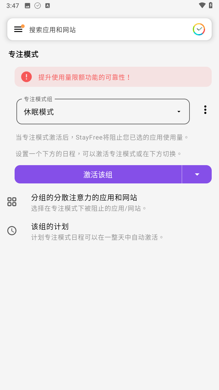 Stay Free是一款没有广告,完全免费的实用工具软件,通过其可以直观的看出用户在使用设备时,其中每一个软件每天的使用时长,且可以自行的对某一个应用进行时长的控制,以起到更高效完成任务的目的,还能够将数据进行记录,十分的方便。对于管不住自己,时刻想要进行手机游玩的用户,只需将本软件设定为专注模式,即可控制设备的使用时长,需要的用户可以点击立即下载。