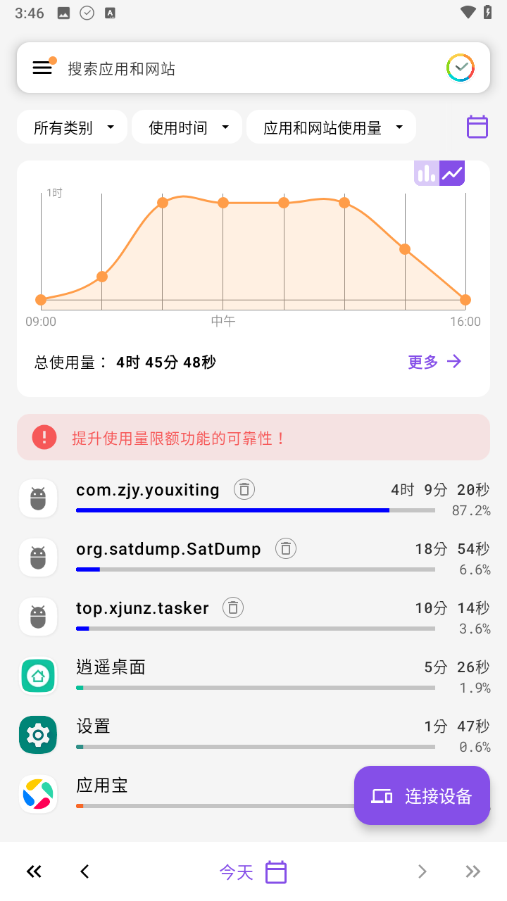 2、提供实用工具,这个工具可以直观显示使用时长最多的应用以及总使用量。