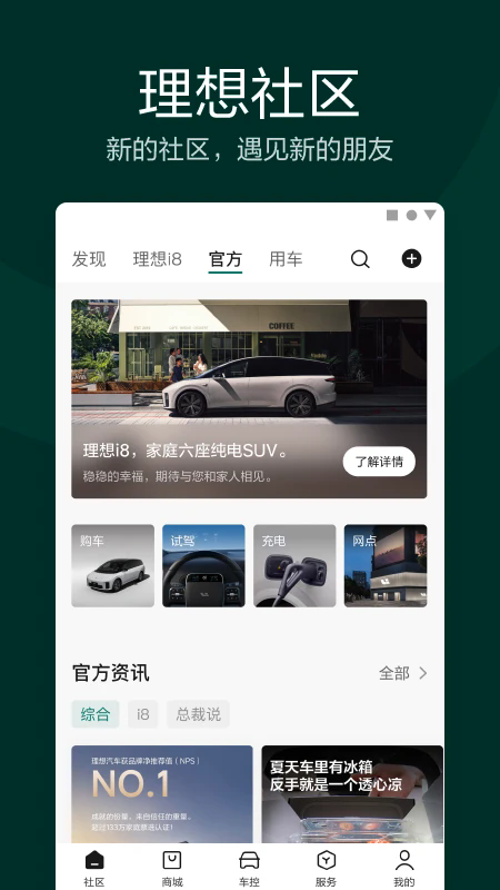 理想汽车app是一款为用户专门打造的智能手机汽车互联软件,如果你想要购买理想汽车的话,这款软件是个不错的选择,在这里你可以获取车辆全面信息,还通过预约试驾进一步了解车子的性能、优缺点等。同时还有十分丰富的功能,如社区交流、远程控车、车辆状态监控、汽车资讯等多种功能。理想还会为车主提供汽车售后和保养等专业服务。