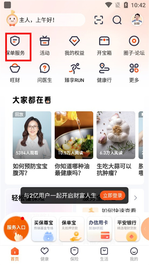 1、点击“保单服务”,在平安金管家APP首页点击进入“保单服务”。