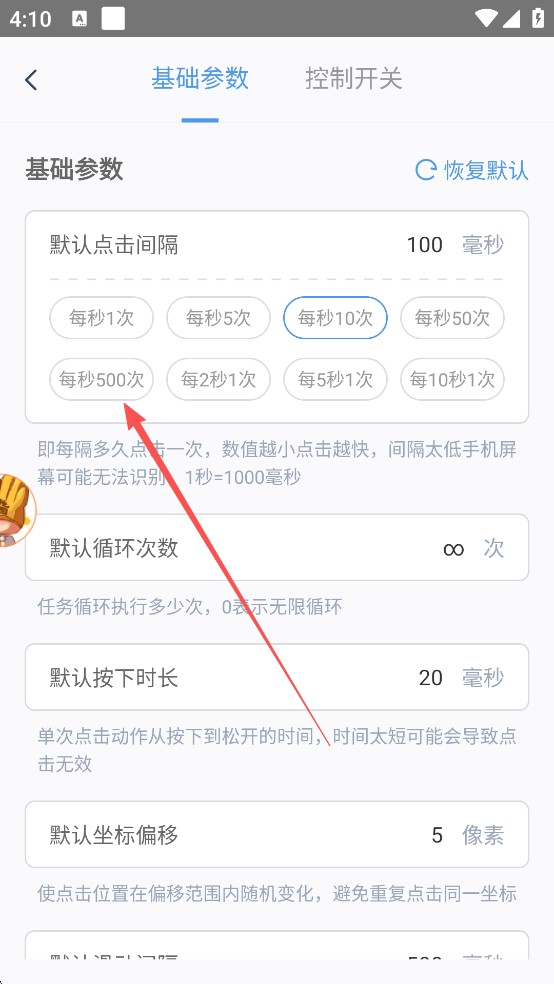 2、找到默认点击间隔和默认按下时长,调节到快便能点击的最快!
