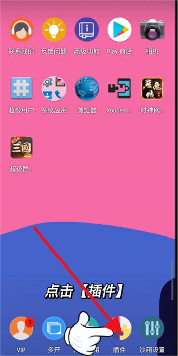 1、首先,进入到沙箱软件的桌面上,点击右下角【插件】按钮,点击进入其中;