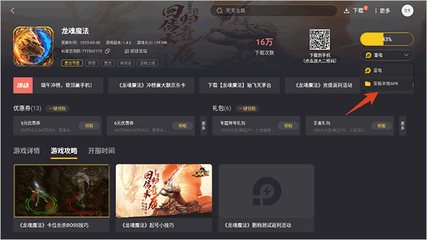 1、雷电游戏中心用户进入app后可以在不登录的情况下直接下载游戏,下载时还可以选择只下载apk文件,然后用户手动安装