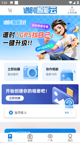 1、在首页中提供了立即拍摄和协作相册等功能,同时可以立即创建你的相册,还可以了解当月收入等信息;