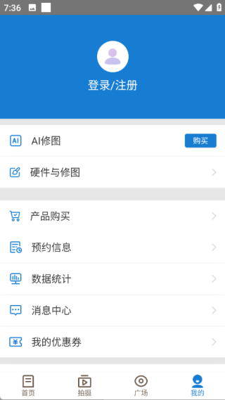 4、进入到我的页面中可以进行购买AI修图功能,同时还可以进行其它产品的购买,还可以了解数据统计等信息。