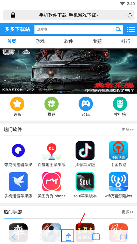 1、打开Safari浏览器苹果版,然后打开一个网页,点击下方向上箭头按钮;