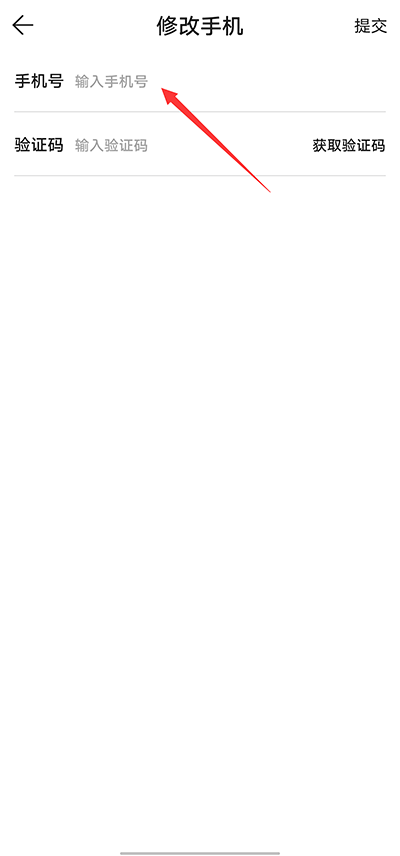 3、进入手机修改页面,输入号码和验证码之后,点击提交即可绑定。