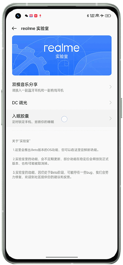 3、进入realme实验室后,找到并点击入眠胶囊选项