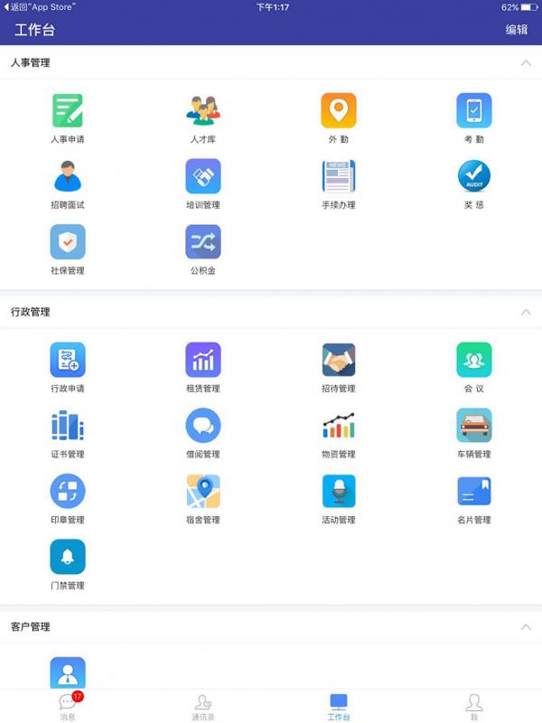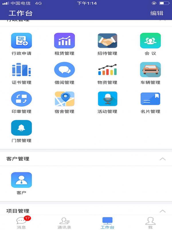 包含企业需要的移动业务,比如协作、邮件、日程、资产管理、客户管理、人事管理、行政管理、印章管理等中小企业完备的管理功能;