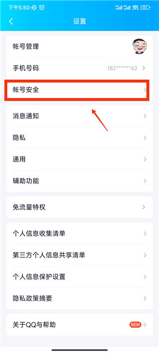 4、翻转至设置界面后,找到帐号安全选项并点击;