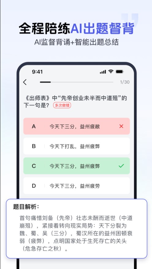 背书匠是高效实用的AI记忆背书工具,融合智能算法与多感官记忆方式,构建完整的记忆学习闭环,适用于多种学习场景。背书匠软件提供丰富的记忆训练方法与题目练习,支持反复强化记忆,对易错内容进行重点分析并配有详细解析,帮助用户形成清晰的知识框架,实现多维度高效背诵。无论是考研、考编、考证、语言学习、职场提升,还是日常自我学习,背书匠都能有效提升记忆效率,助你轻松开启“学霸模式”。