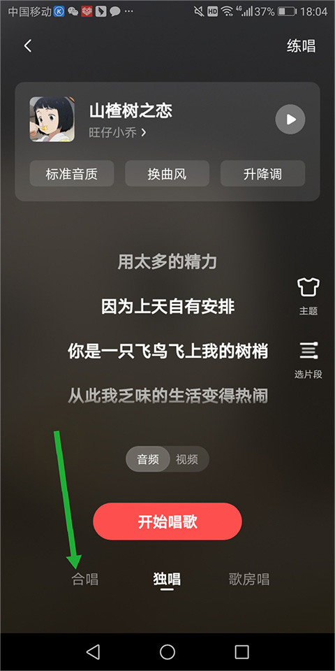 2、在打开的新页面中点击底部的【合唱】(下图绿色箭头所指区域)。