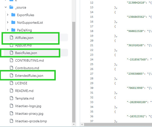 这里主要提供了三个规则代码,一个是基础规则代码、一个是扩展规则代码、一个就全部规则代码,从字面上意思也不然理解全部规则代码就是包含了基础规则代码和扩展规则代码,是在github代码库列表中所呈现的。如下图所示,用户只要在代码列表中找到json文件即可,这些规则代码就是以json格式书写的,有点编程经验的用户一看到json文件自然就知道其强大的跨平台文件交换功能了,在很多编程场景都能用到,无论是c++,还是java,无论是前端还是后端开发者都要接触并使用到这种格式文件的。