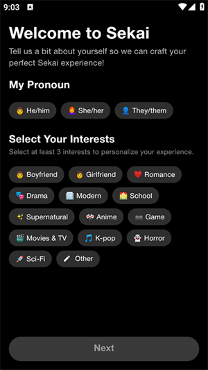 2、选择你的性别、兴趣类型;