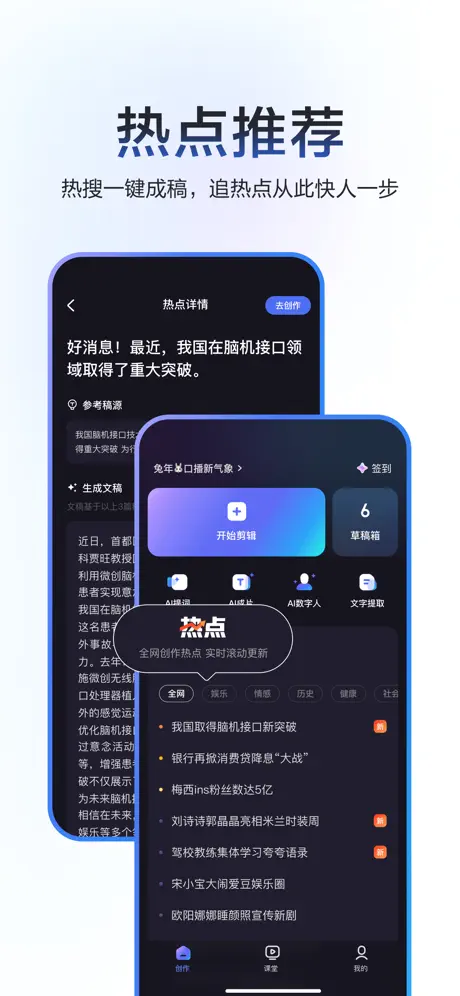 1、【热点推荐】AI电影支持热点推荐,每日500+话题滚动更新,热搜一键入稿,热点从此更快一步。