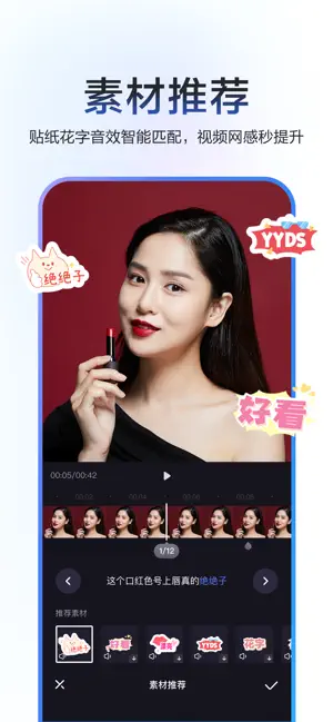 2. 文字编辑与配音:提供丰富的花字贴纸素材和高质量的语音包,为视频添加趣味文字和专业配音。