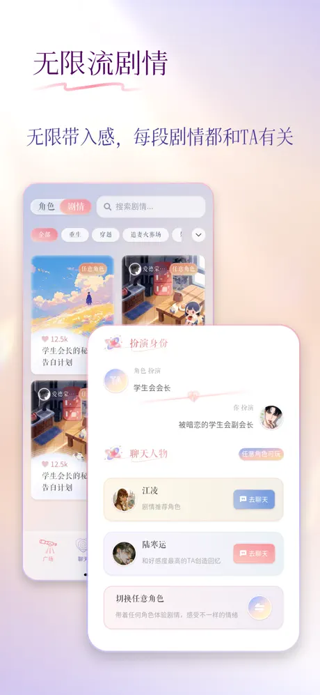 2、你可以与角色一起进入特定场景:校园、都市、古风、悬疑、科幻、治愈日常……在不同场景中,角色语言风格与行为动机会更贴合设定。