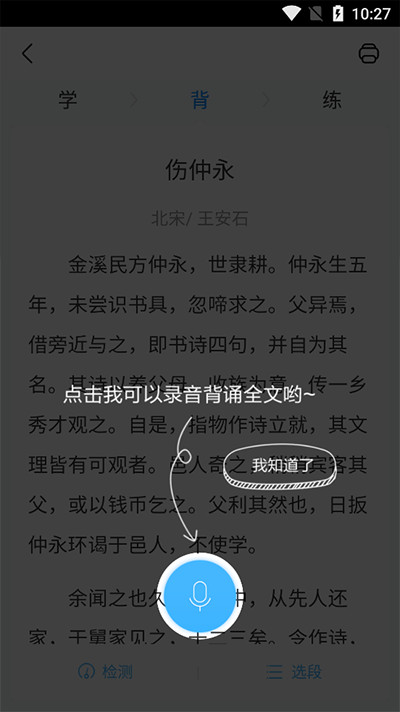 4、再说背诵,同样是选择教材和课文,选定后进入背诵,先会显示课文或背诵内容,点击开始背诵后内容消失并开始录音,边录音边识别边显示出已经识别的你背诵的内容。