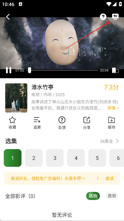 5、投屏播放:确保手机和电视连接同一WIFI,进入播放界面点击TV按钮,选择电视设备完成投屏。
