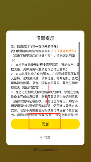 1、首次启动飞猪旅行机票预订应用程序时需要仔细阅读并确认相关服务协议与隐私政策,点击同意按钮后即可进入系统主界面开始使用各项功能。