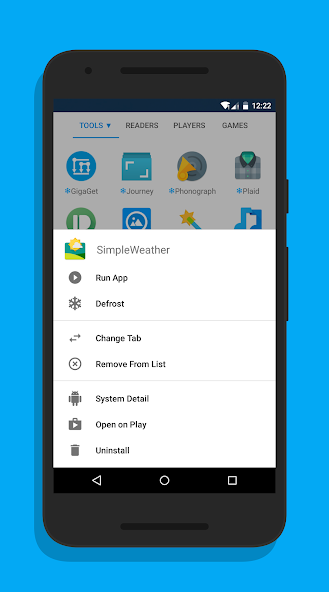 冰箱IceBox老版本可以帮您把那些你不喜欢但有时不得不用的 App 冰冻起来。 冰冻状态下的 App 也会从桌面隐藏掉。点一下冰箱里的图标,则会解冻并运行。锁屏数分钟后,又会自动冻起来。这样就可以有效的防止它们在后台偷电偷流量。