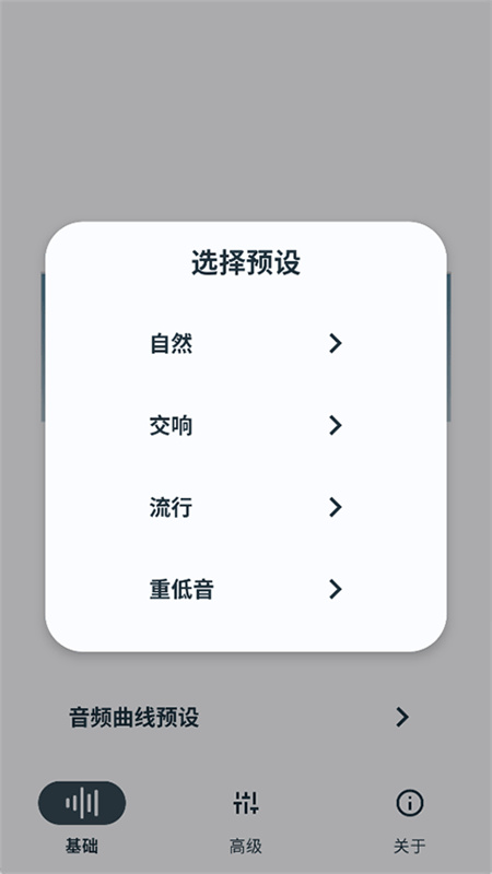 4、选择音频曲线预设,可以自由选择自然、交响、流行、重低音进入调音