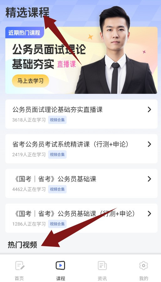 3、课程界面可查看精选课程与热门教学视频等学习资源。