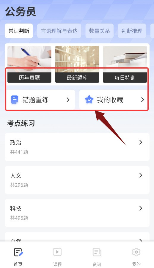 2、首页提供历年真题、最新题库、每日特训与错题重练等功能。