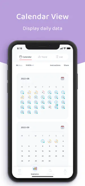 5、每日统计日历,能够呈现出每日的喝水数据和趋势变化。