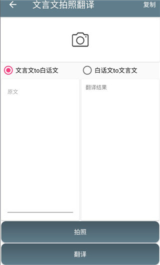 2、拍照识别:用户可以通过拍照的方式直接上传文言文内容,应用会自动识别并提供翻译结果,这大大简化了输入过程,尤其适合处理书籍或纸质文档中的古文。