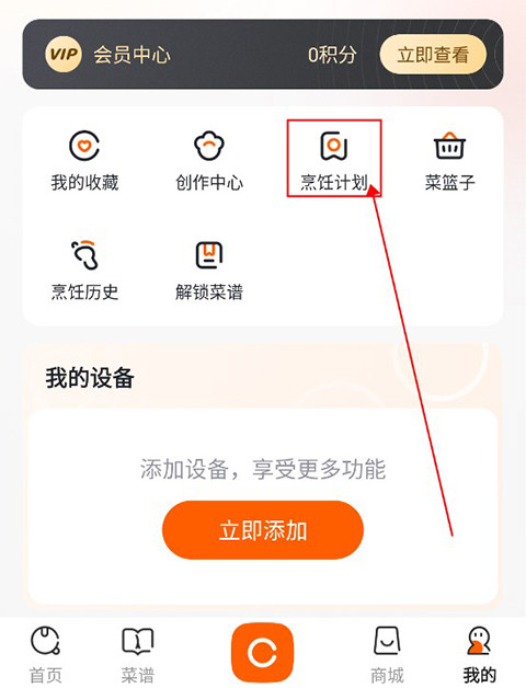 之后用户在主界面点击“我的”,进入个人中心,点击上方的“烹饪计划”,就可以查看到自己刚刚添加的套餐计划,进行系统的学习和制作美食啦!