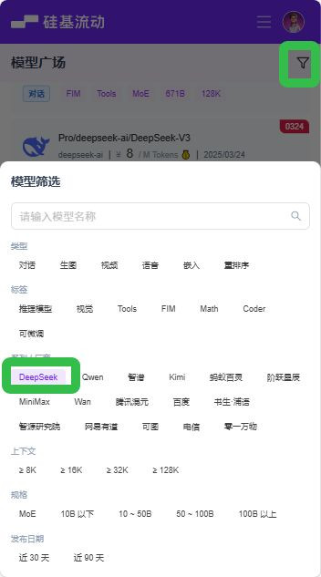 5、返回模型广场,打开右上角筛选器,选择【DeepSeek】。
