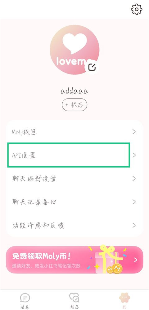 8、然后打开lovemo app,进入【我】页面,点击【API】设置。