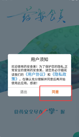 1、在药安食美确认接受用户协议后,即可进入应用主界面。此操作代表您已阅读并同意相关条款,准备使用药品信息服务。