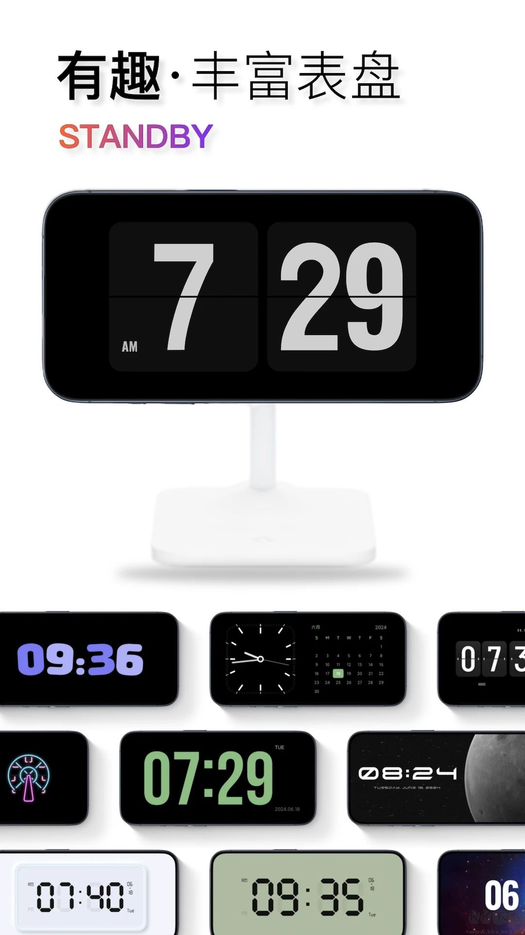 【海量创意主题】提供多样主题与丰富时钟样式,选择更多;支持自定义背景壁纸、字体颜色与翻页动画,打造独特样式;