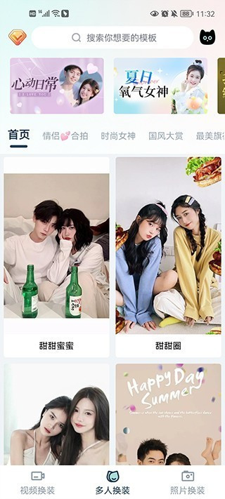 1、安装脸猫照片编辑后打开,首页展示着各类换装模板,分类清晰直观。