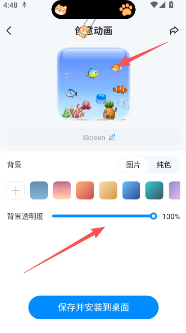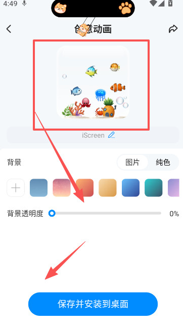 3、为了满足大家的透明背景设置需求,可在背景透明度直接降为0%,效果也就从刚才的完全展示变成了透明动画展示,非常的个性,确定请保存并安装到桌面,重启设备后生效。
