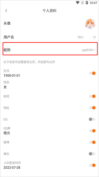 4、进入个人资料界面后,点击页面中的昵称菜单。