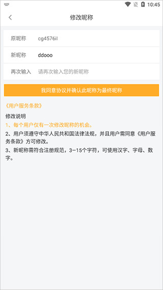 5、进入修改昵称界面后,输入新的昵称,点击同意协议,完成昵称修改。