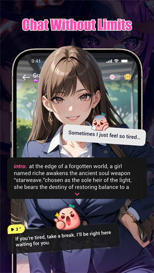 3、每个AI角色都拥有独特的背景设定、性格特征和语言风格,确保每一次对话都充满新鲜感与情感共鸣,自由进行聊天了。