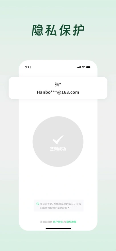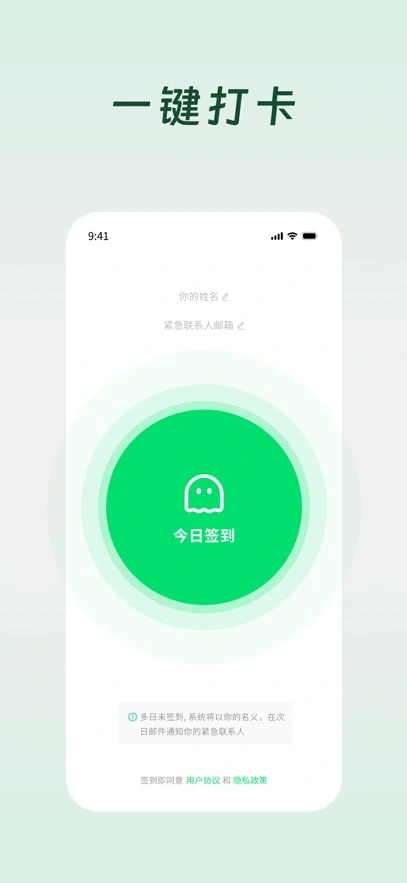无需注册登录,首次使用只需填写联系人姓名与邮箱即可完成设置,每日打开应用轻轻一点完成签到,后台自动监测状态,不干扰日常习惯,操作轻便易上手